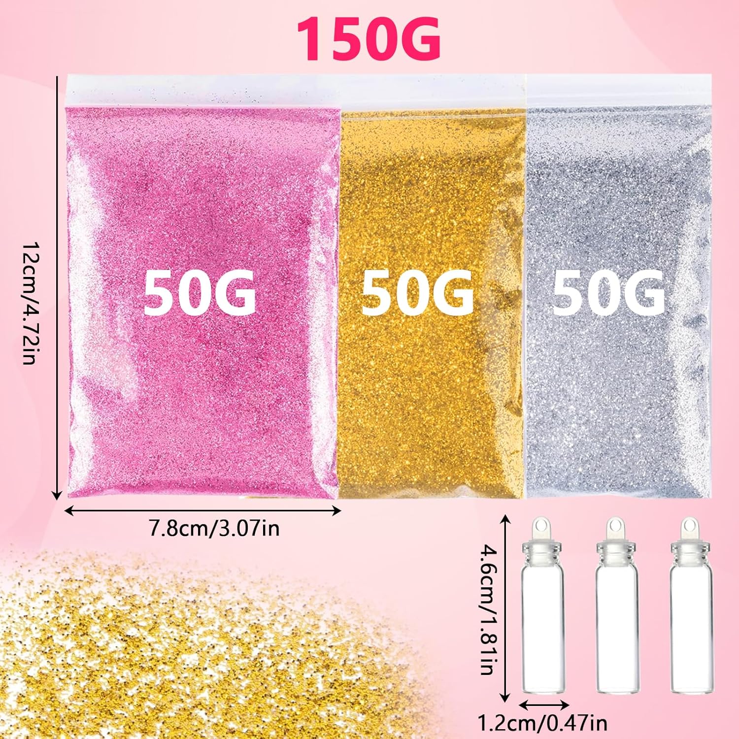 150 g glitter met plastic doos: 150 g glitterpoeder en 3 plastic dozen, 3 kleuren: 50 g goud, 50 g zilver en 50 g roze. Aparte doos voor eenvoudige opslag en niet gemakkelijk te breken, gemakkelijk toegankelijk en vermindert rommel.