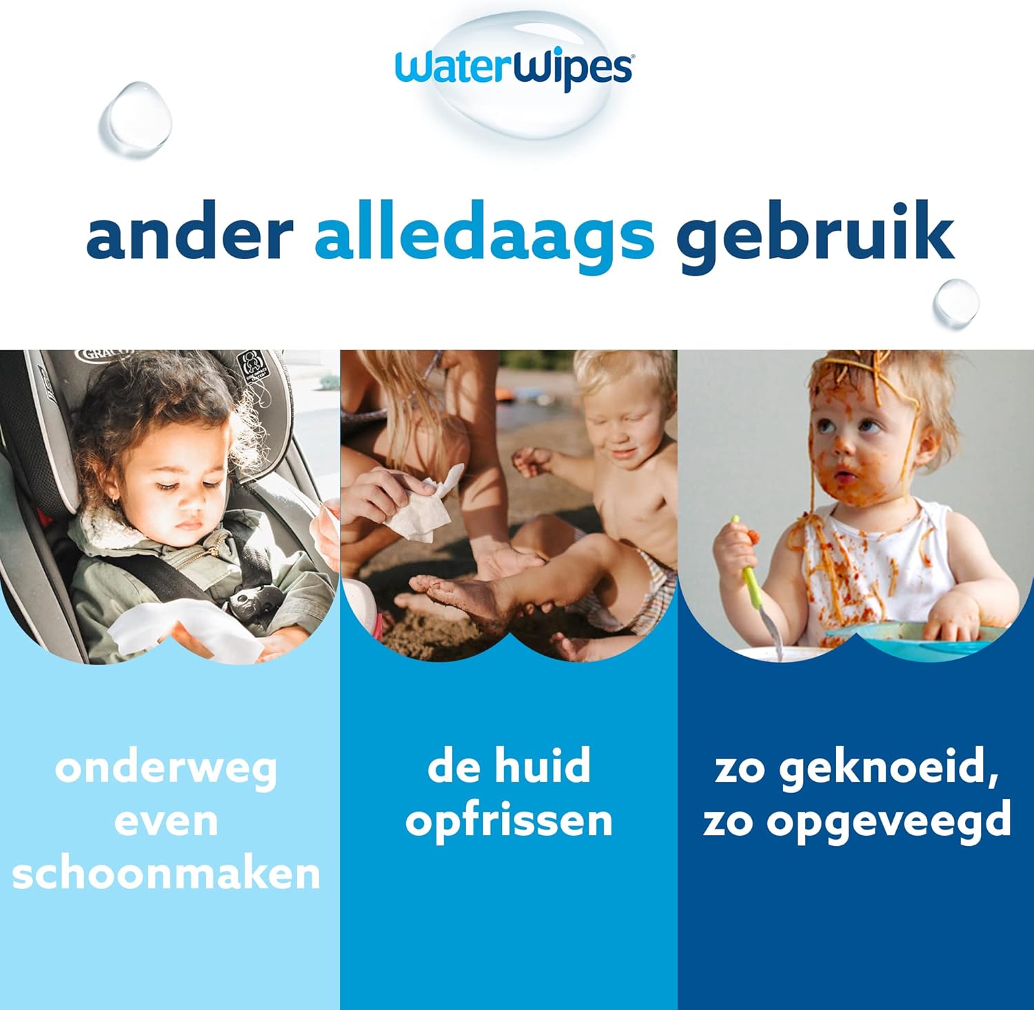 MEER TOEPASSINGEN: Waterwipes zijn ideaal voor allerlei gelegenheden. Verfrissend op warme dagen en handig voor vlekjes in kleding. Bewaar ze in je tas of auto en je kunt onderweg van alles reinigen.
