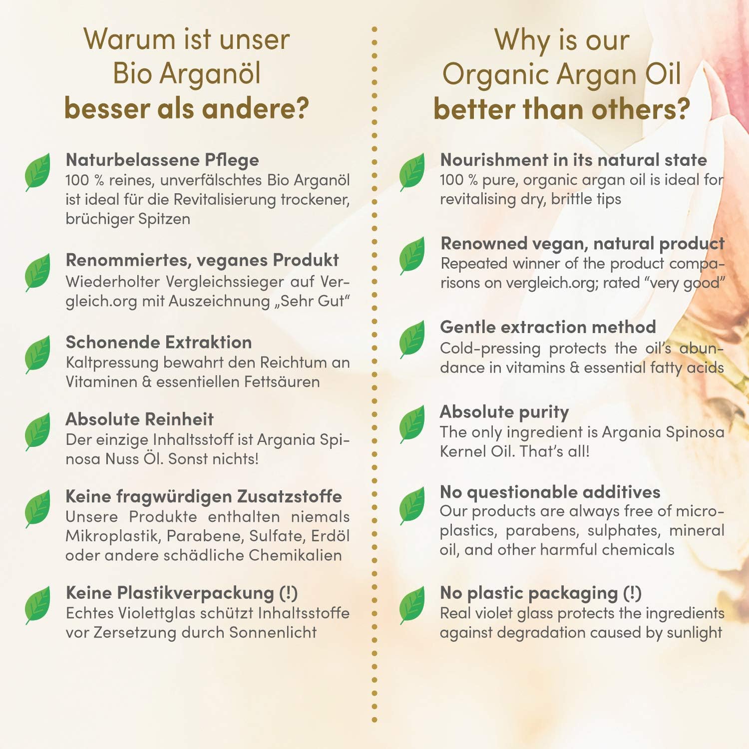 Zuivere, natuurlijke olie met slechts één ingrediënt: argania spinosa kern Door middel van zacht koudpersproces uit de kernen van de argannoot gewonnen Rijkdom aan vitaminen, mineralen, essentiële vetzuren en eiwitten: Verzorgd en gezond haar Geen toevoegingen, conserveringsmiddelen of geurstoffen. Zonder parabenen, sulfaten en andere chemicaliën Veganistisch en dierproefvrij. Biologische natuurlijke cosmetica uit duurzame teelt in Marokko Gedetailleerde gebruiksaanwijzing met doe-het-zelfrecept wordt meegeleverd (mogelijk niet beschikbaar in het Nederlands)