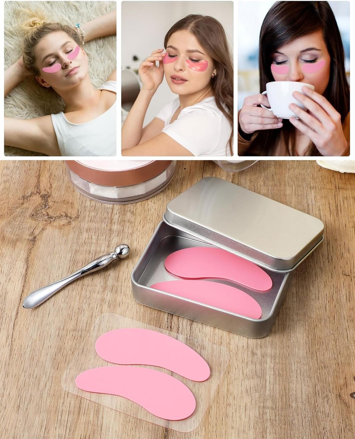 WUNZILO 1 paar herbruikbare oogkleppen, siliconen oogpads, herbruikbaar onderoogmasker voor het opvullen van fijne lijntjes en rimpels met oogcrème-applicator van metaal en blik (roze)