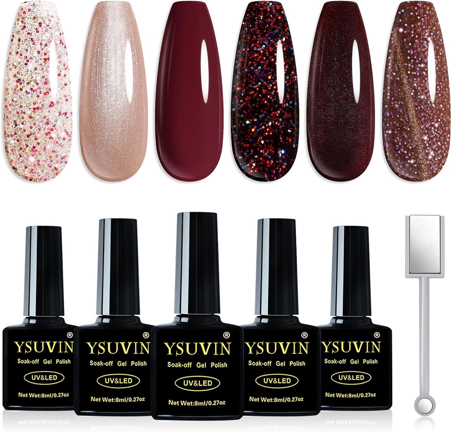 YSUVIN Nagellak Set – 6 Kleuren Bourgondië Glitter Nude Bruin Rood Gel Polish – Soak-Off UV Voor Beginners DIY Nail Art Manicure Salon – Langdurig, 8 ML