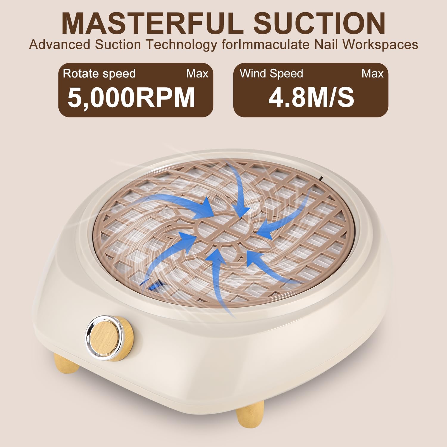 Instelbare zuiger: deze stofafzuiging voor nagels is uitgerust met een hoogwaardige zuigmotor die het vijlen van de nagels aangenamer maakt. Uitgerust met verstelbare knoppen, kun je de zuigkracht naar wens instellen