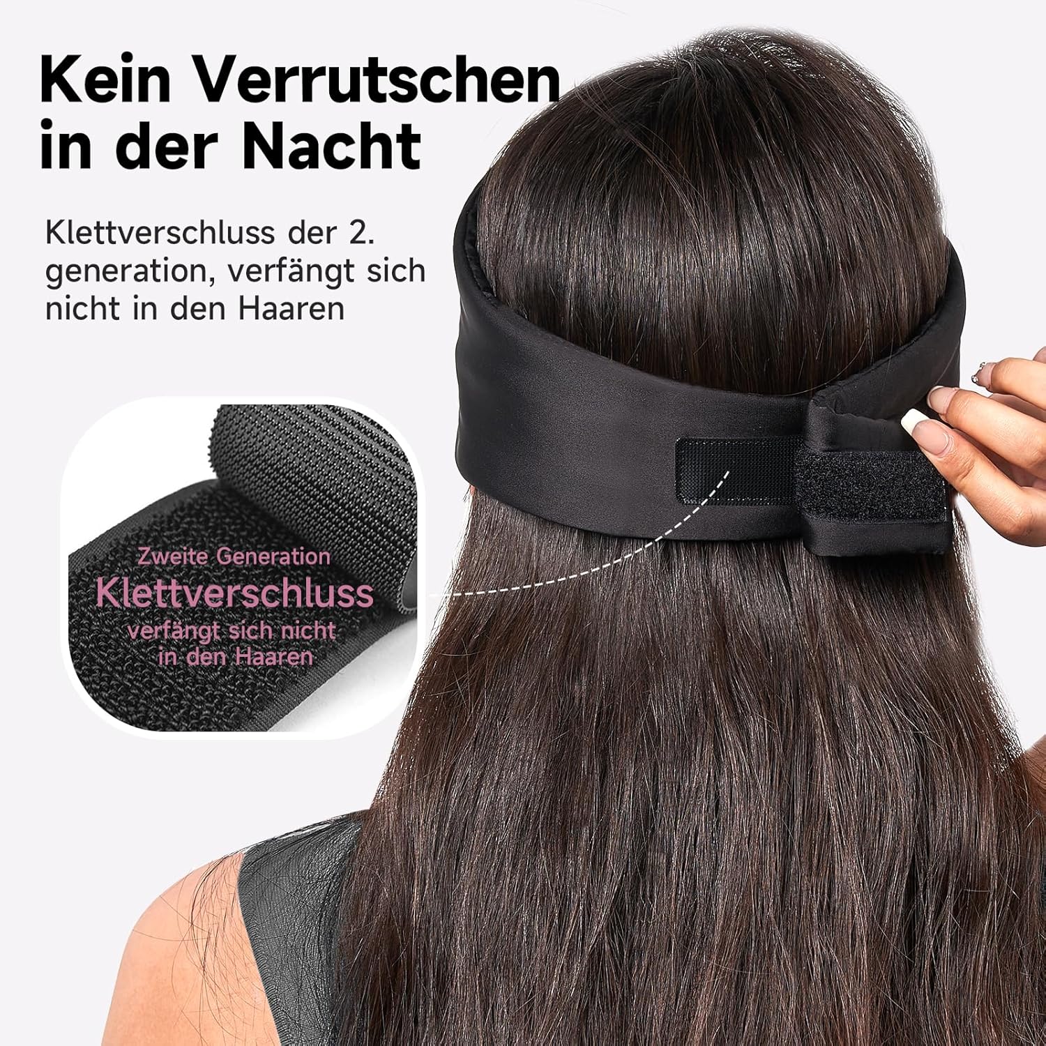Haarverzorging klittenbandsluiting: de tweede generatie klittenbandsluiting voorkomt dat het haar tijdens het slapen wordt getrokken en zorgt ervoor dat de maat vrij instelbaar is om aan verschillende hoofdmaten te voldoen