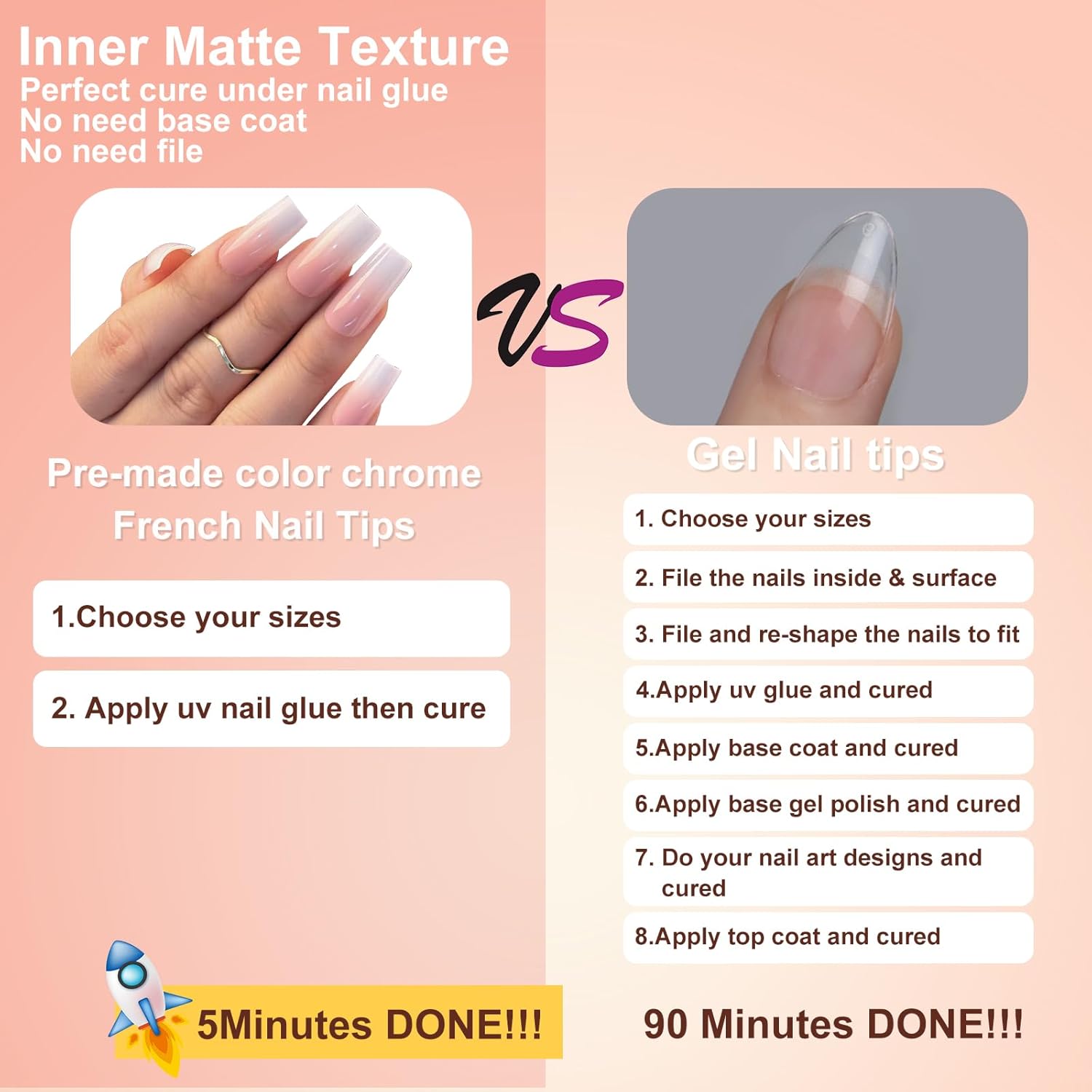 Improved 4-in-1 gel nail tips:French Tip false nails are made with soft gel. The colour and the designs on the tips are made of gel polish, not printed with ink. We follow the handmade process step by step of a layer of base coat, color gel, pattern and buliding gel finish. You will look like you just completed an amazing nail artwork in the salon