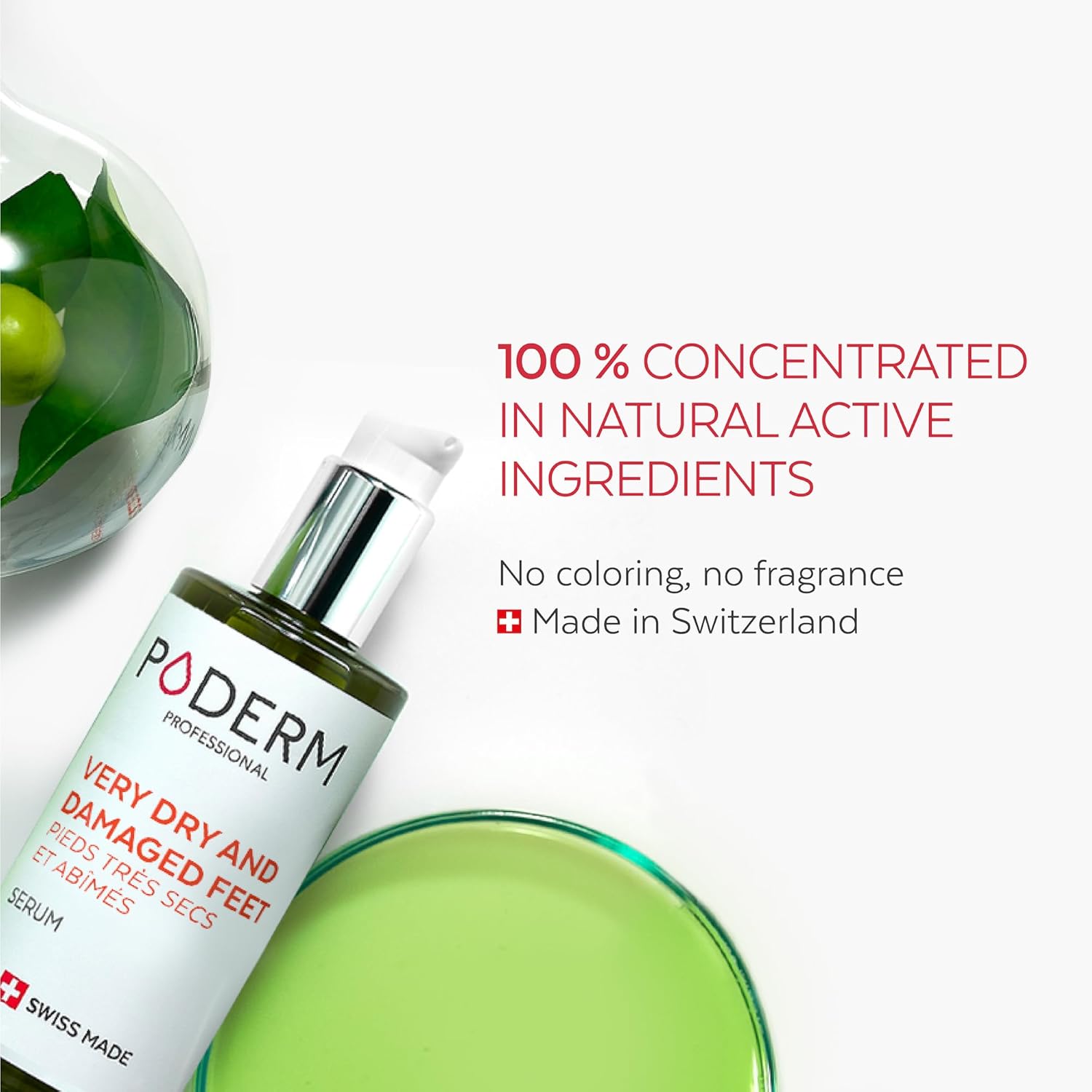 De formule is rijk aan sheaboter, bekend om zijn voedende werking, en biologische essentiële olie van zoete sinaasappelschil, die zachtjes dode huidcellen exfolieert. Het bevordert de regeneratie van de huid zonder deze overmatig te stimuleren en voorkomt het ontstaan van eelt. De formule van het serum voor Zeer Droge en Beschadigde Voeten PODERM is 100% natuurlijk, zonder parfum, zonder kleurstoffen en bevat geen water voor een ultra-geconcentreerde verzorging.