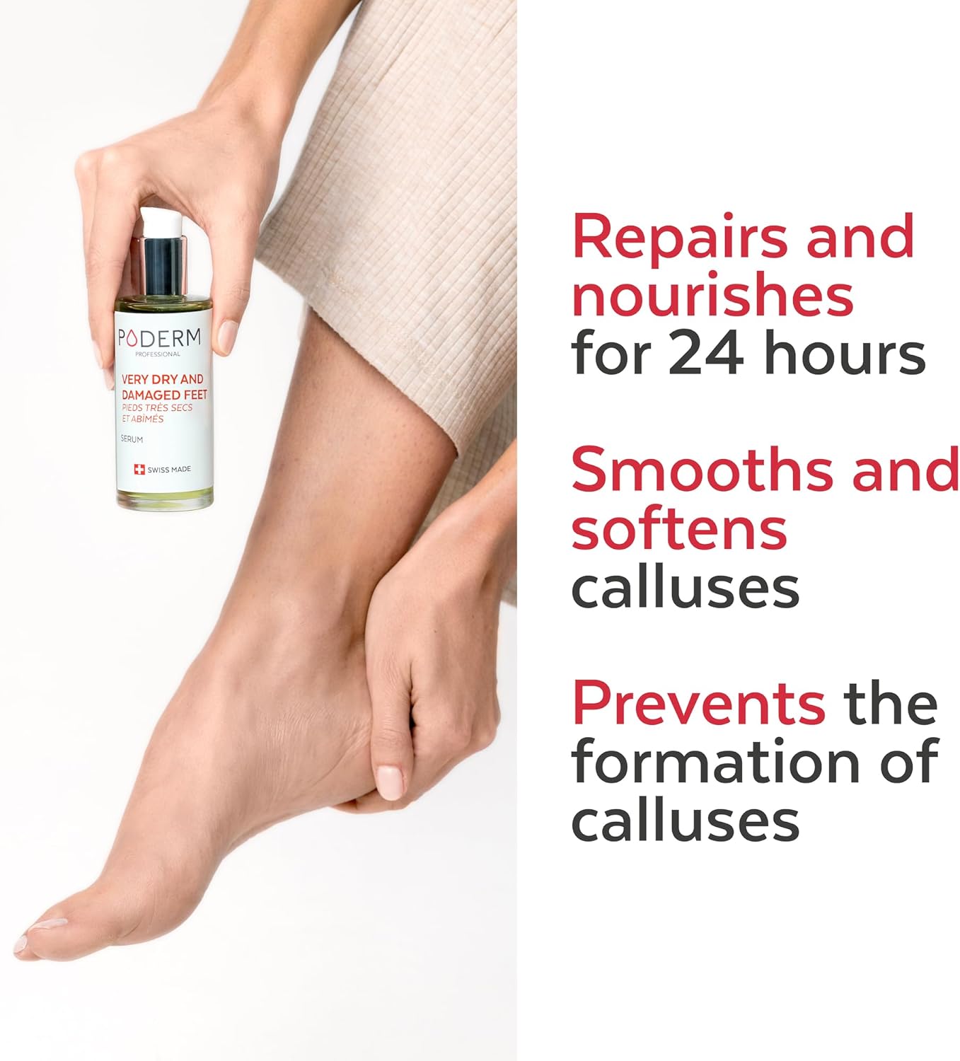 Het serum voor Zeer Droge en Beschadigde Voeten PODERM herstelt en voedt intensief de zeer droge voeten gedurende 24 uur. Het verzacht harde huid, egaliseert ruwheid en geeft de huid zachtheid en soepelheid.