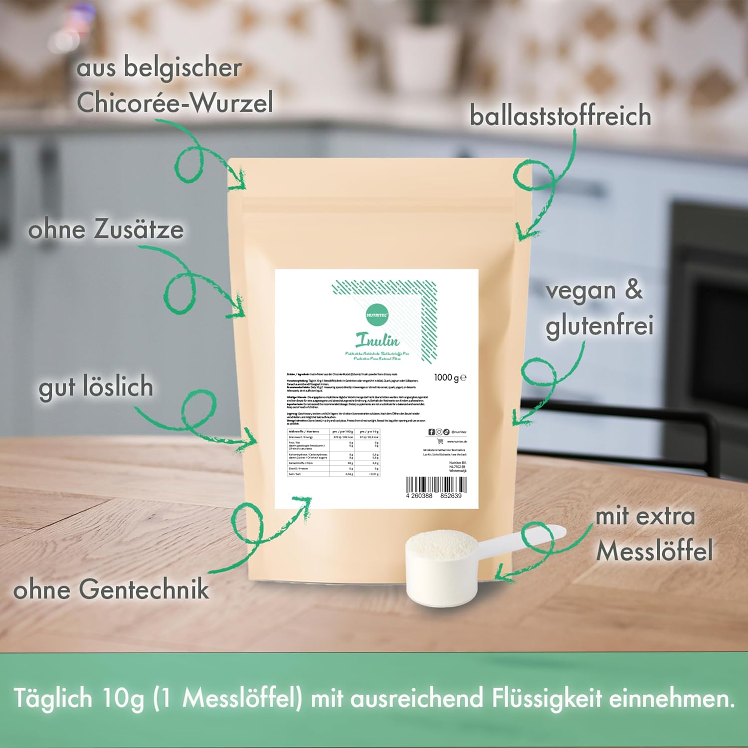VEELZIJDIG TOEPASSING: Nutritec inuline is goed oplosbaar en smaakt neutraal. Het kan worden gebruikt bij het bakken, zoeten van dranken en als suikervervanger. Bovendien bevat het aanzienlijk minder calorieën en veel meer vezels dan suiker.