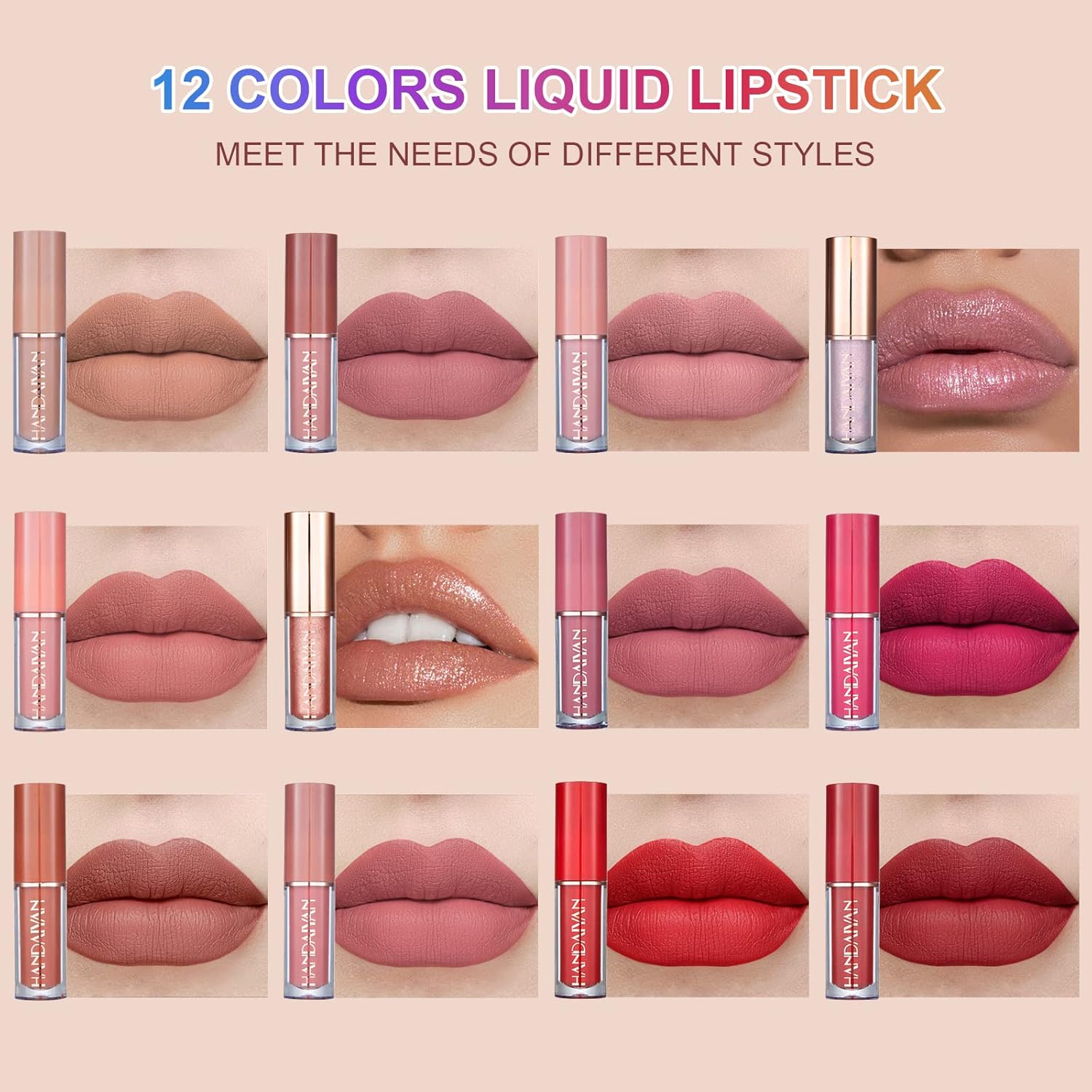 Matte Liquid Lipstick Set: This lipstick set contains 10 matte lipsticks and 2 shimmering lipsticks, from classic nude to bright red tones, these are the most popular colors and daughters