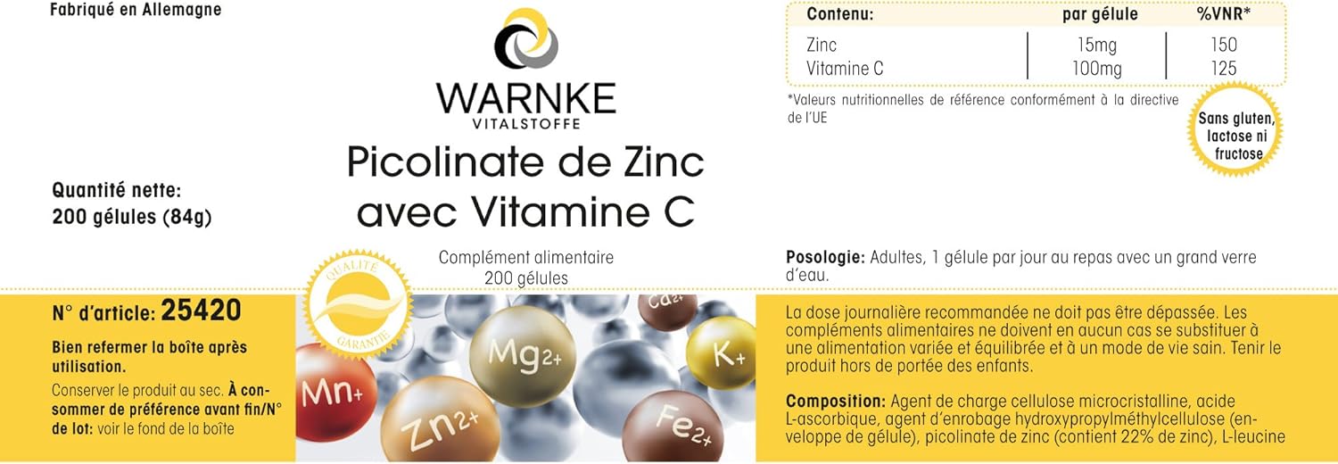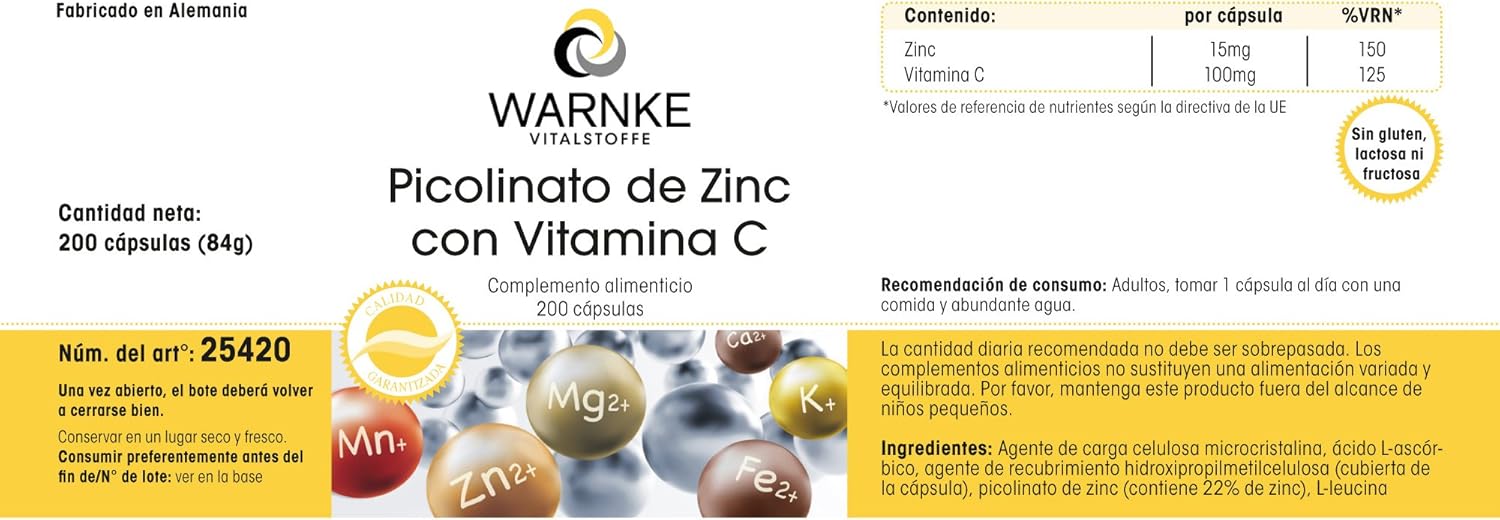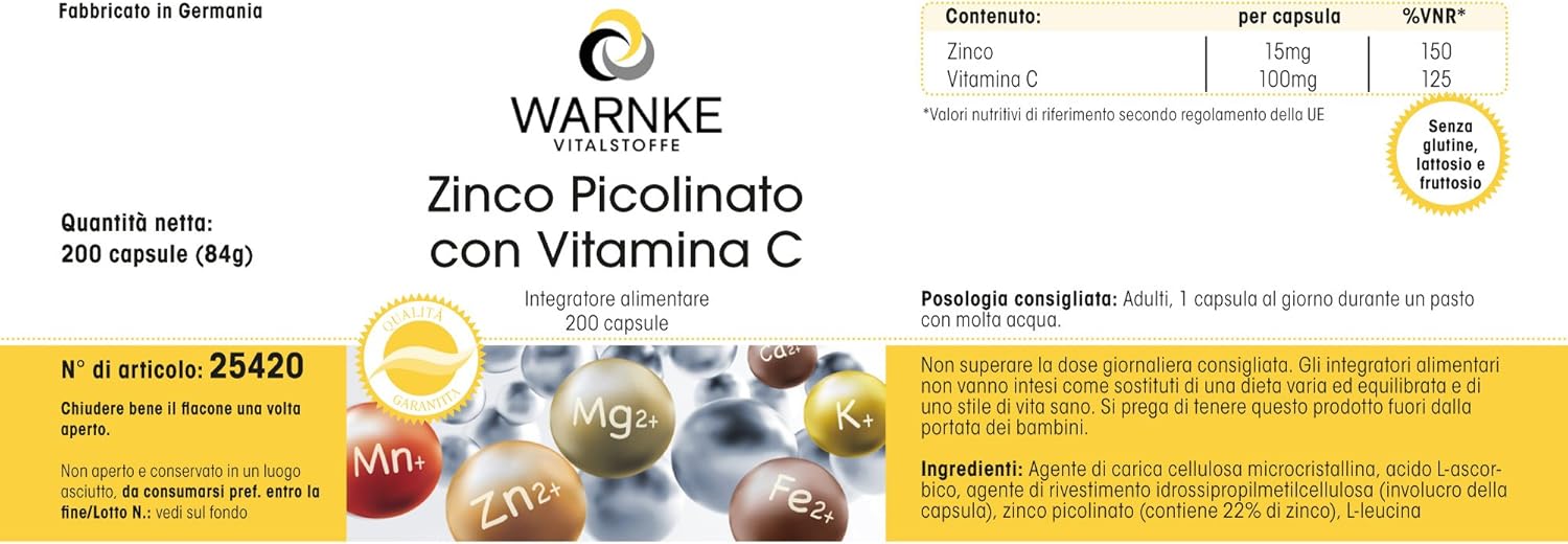 Zink + Vitamine C – 15mg zink per capsule – hoge dosering & veganistisch – van zinkpicolinaat – 200 capsules | Warnke Vitalstoffe – Duitse apothekerskwalitei