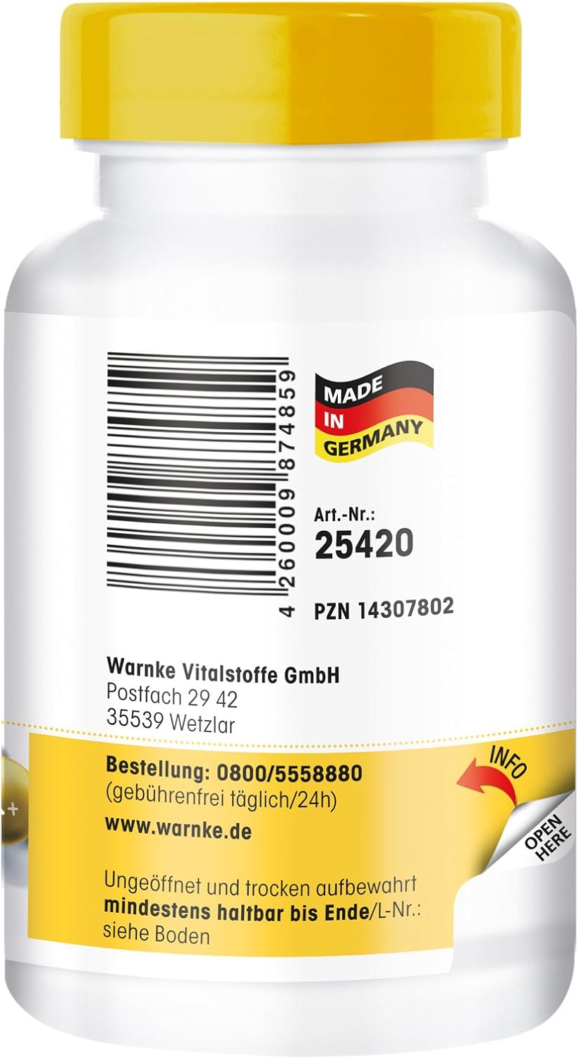 Kwaliteit en klantvriendelijkheid: Onze producten voldoen aan de HACCP-kwaliteitsnormen. Vervaardigd in Duitsland. Grondstoffen uit EU- en niet-EU-landen. De geoptimaliseerde verpakking met een verzegeld doseerdeksel zorgt voor een lange houdbaarheid van uw voedingssupplementen en de eenvoudige dosering ervan.