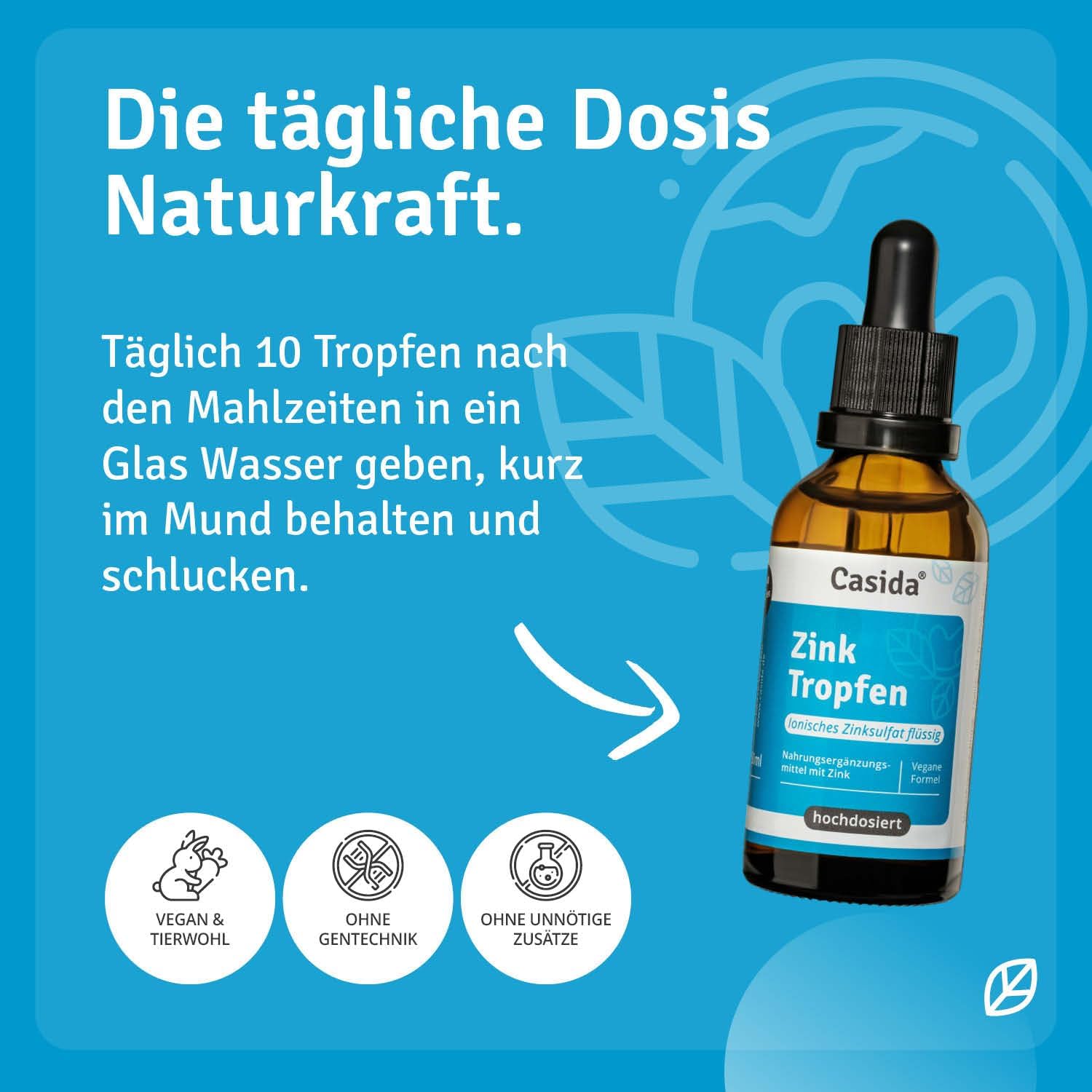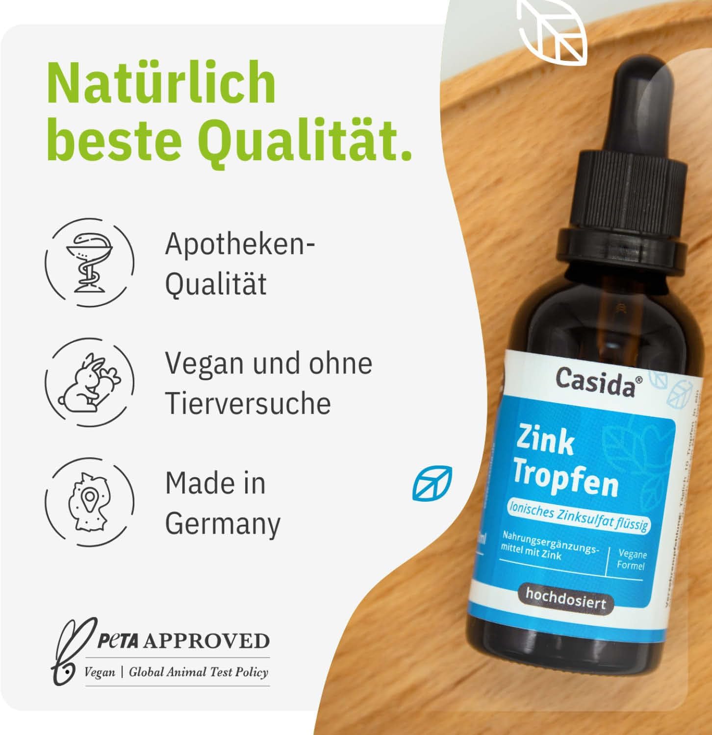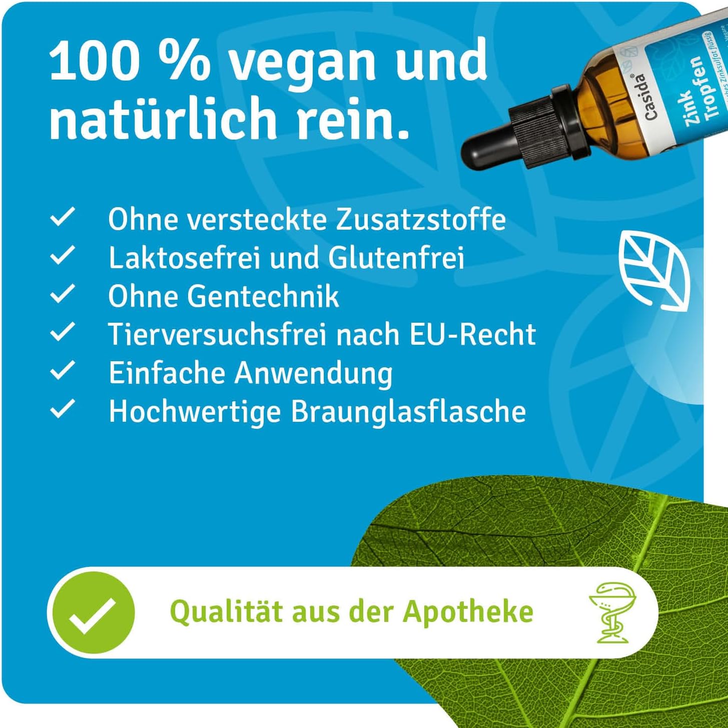 Veganistisch en zonder ongewenste toevoegingen: de Casida zinkdruppels zijn vrij van aroma’s, kleurstoffen, stabilisatoren, vulstoffen, gelatine en natuurlijk ook GMO-vrij, lactosevrij, glutenvrij en zonder conserveringsmiddelen.