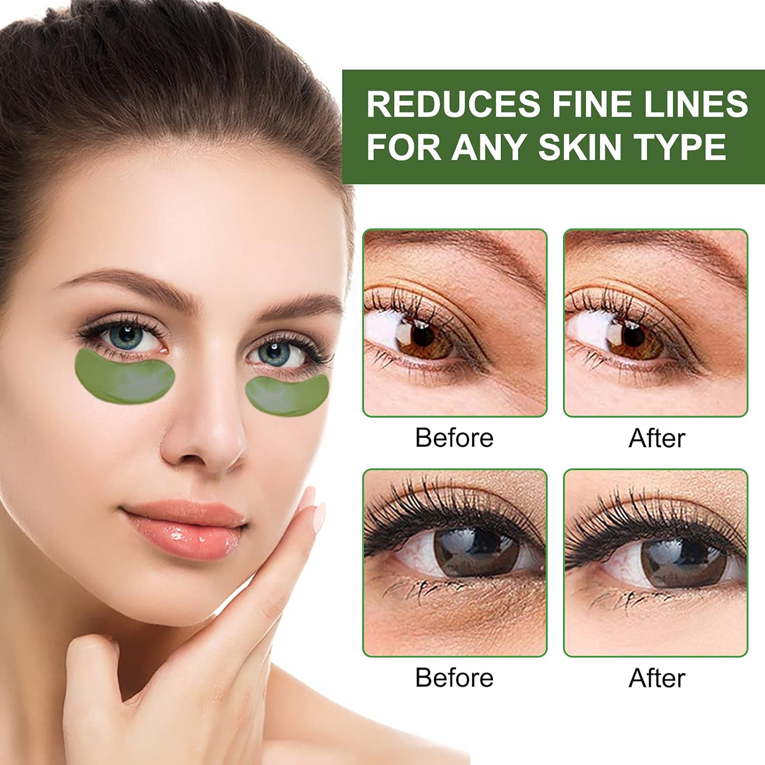 Anti-aging effect – Collageen oogmaskers hydrateren, voller en hydrateren uw huid rond uw ogen onmiddellijk met krachtig hyaluronzuur. Minimaliseert en verzacht fijne lijntjes en rimpels