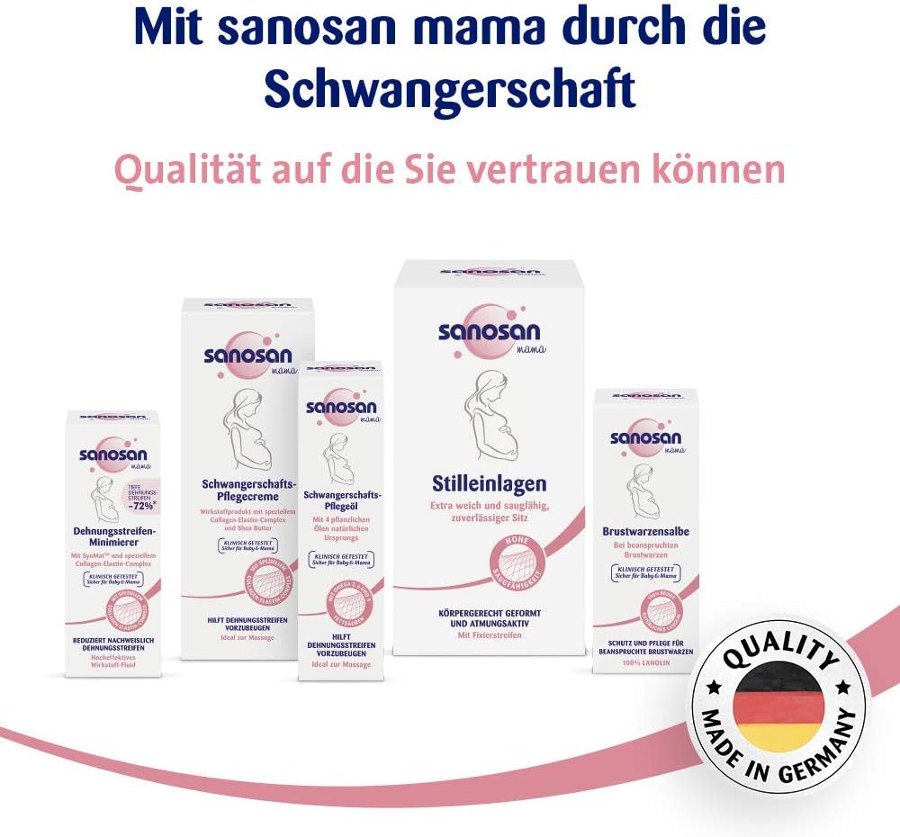 De levering bevat 1 x 200 ml Sanosan zwangerschapsverzorgingscrème om striae te voorkomen – gemaakt in Duitsland.