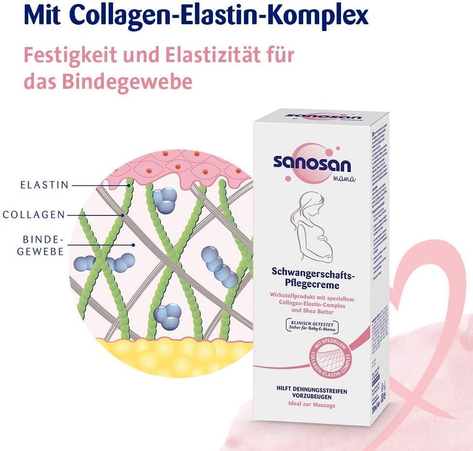 Verzorgende crème van Sanosan met speciaal collageen-elastine-complex houdt de huid tijdens de zwangerschap elastisch en is ideaal voor massage om striae en zwangerschapsstriemen te voorkomen.