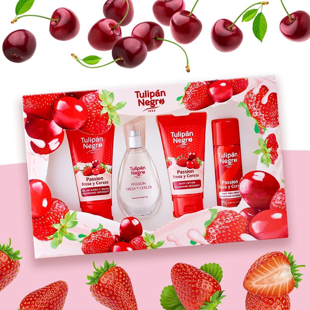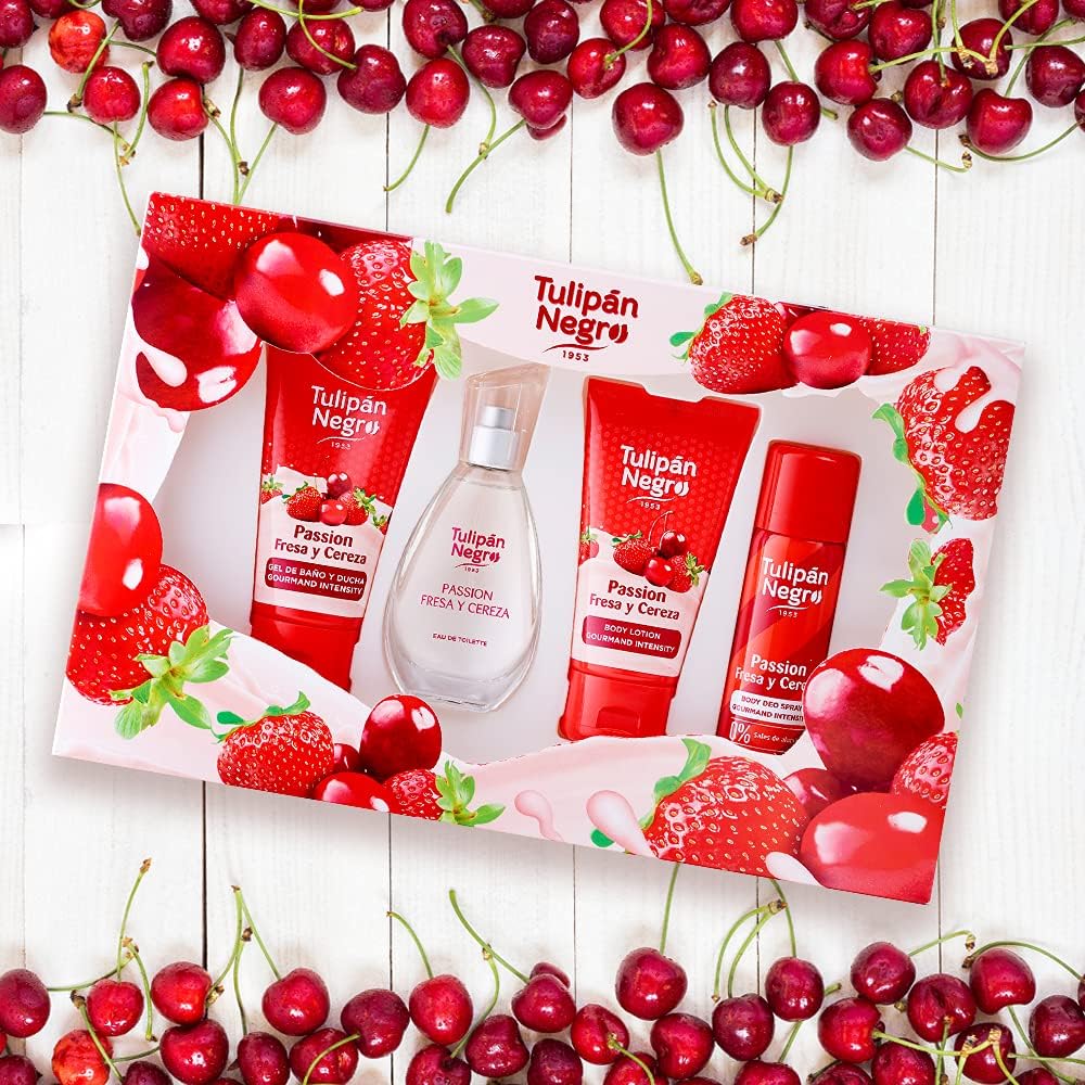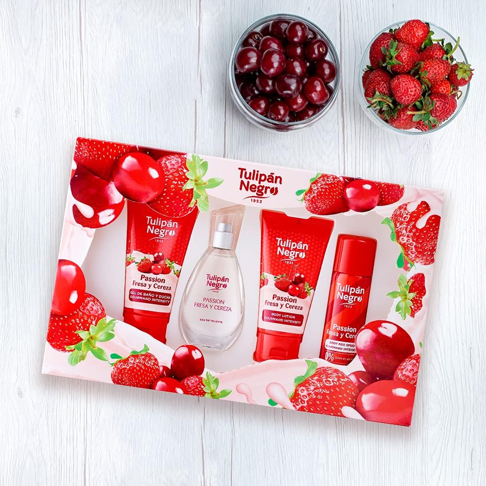 Zwarte tulp, aardbei en kers, cadeauset, uniseks, eau de toilette, 50 ml + bodylotion 75 ml + douchegel 75 ml + deodorantspray 50 ml, zoete en frisse geur, langdurig