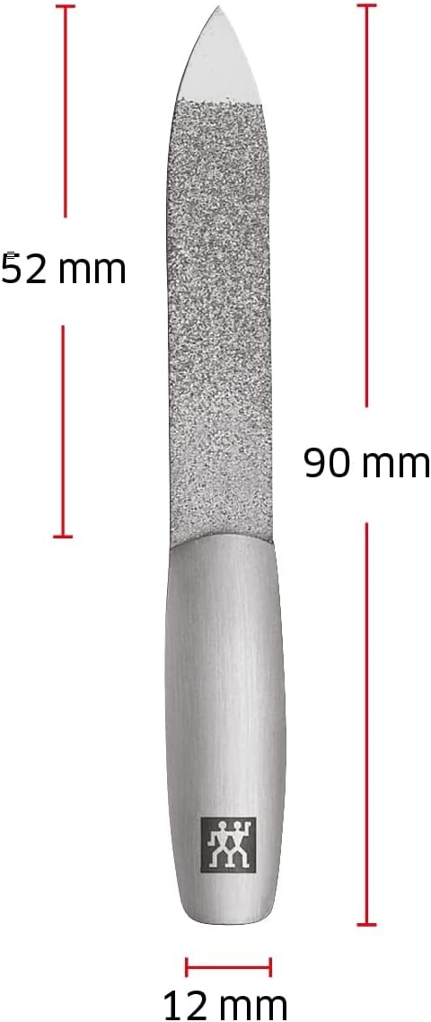De speciaal gecoate premium saffieren nagelvijl combineert perfecte functionaliteit met een elegant design voor de comfortabele verzorging van vinger- en teennagels. De vijl heeft een grofkorrelige en een fijnkorrelige kant voor het inkorten en gladstrijken van de nagels en een punt voor het schoonmaken van de nagels. Het roestvrijstalen handvat met een matte satijnen afwerking en de perfecte ergonomische vorm maken de vijl bijzonder comfortabel, duurzaam en visueel aantrekkelijk. Verkrijgbaar in 90mm en 130mm.