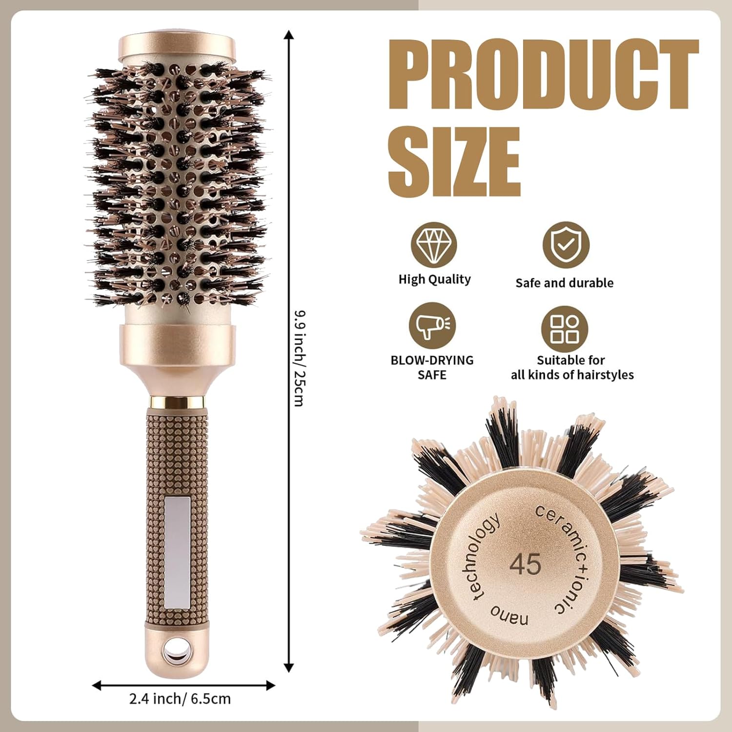 Non-slip handle: This thermal hair brush is equipped with an ergonomic handle. The non-slip rubber design of the round boar bristle hairbrush and brush provides a comfortable grip for styling, which can ensure maximum control for precise styling. Our professional ceramic hair brush is comfortable and allows you to say goodbye to smooth handles and tired hands