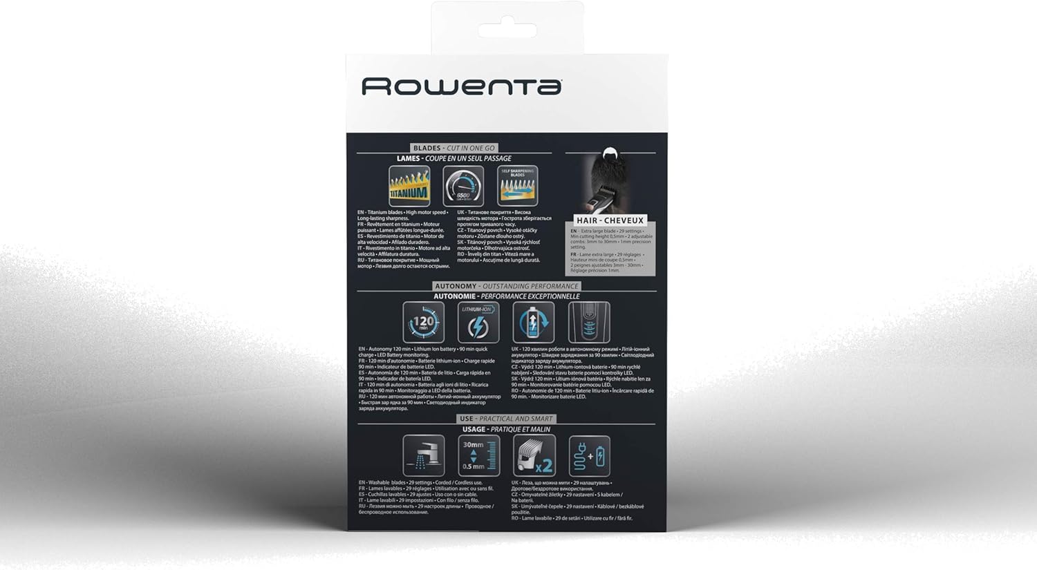 Hair clipper with optimal performance: the stainless steel blades with titanium coating ensure long-lasting cutting performance; optimal cutting accuracy: 29 cutting lengths from 0.5 mm to 30 mm and precision adjustment of 1 mm