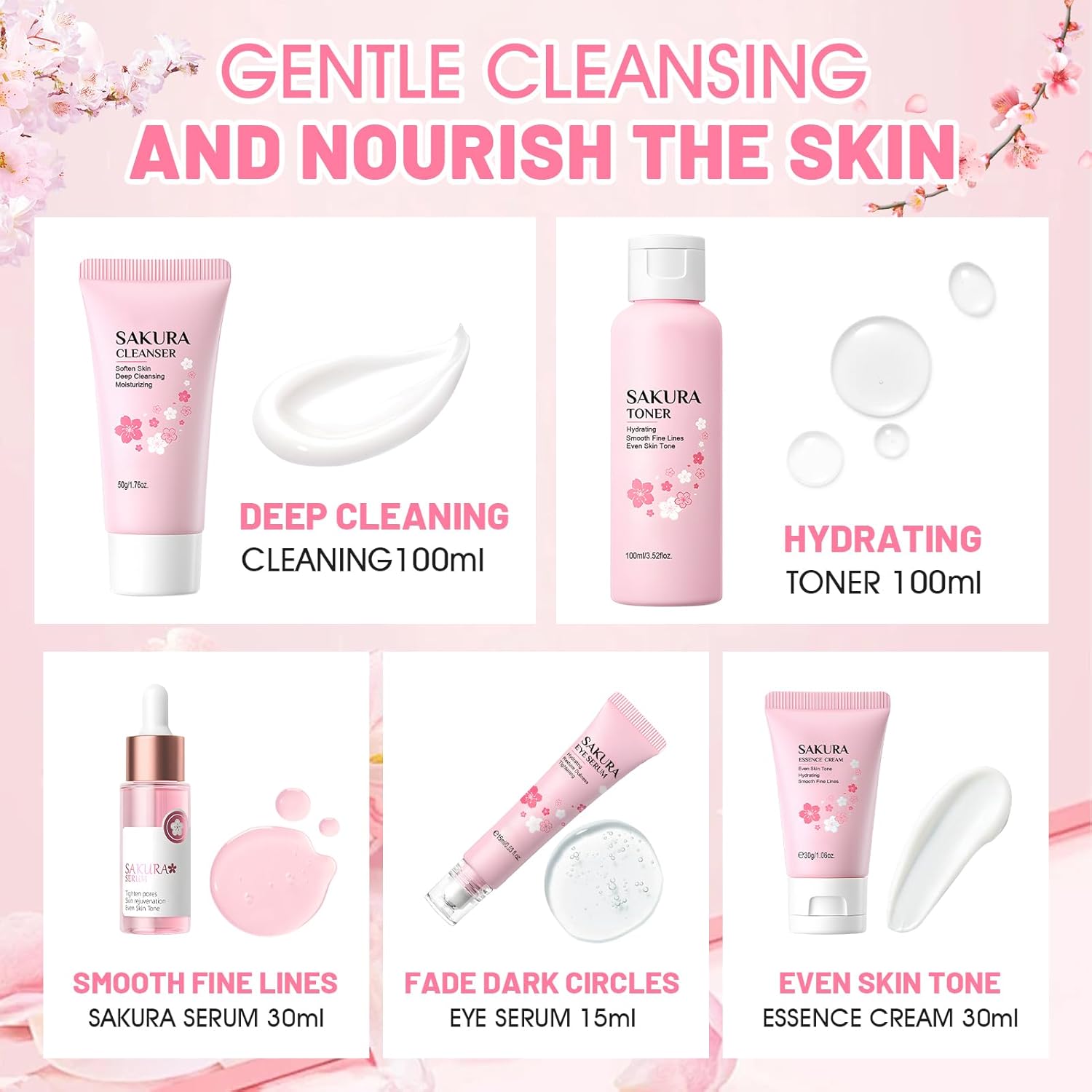 The exclusive Sakura Essence skincare set includes Sakura Cleanser, Sakura Toner, Sakura Essence, Sakura Mask, Sakura Cream, Mask Mud and Sakura Eye Essence. This beauty set is an ideal gift for your daughter, girlfriend, wife and girlfriends.