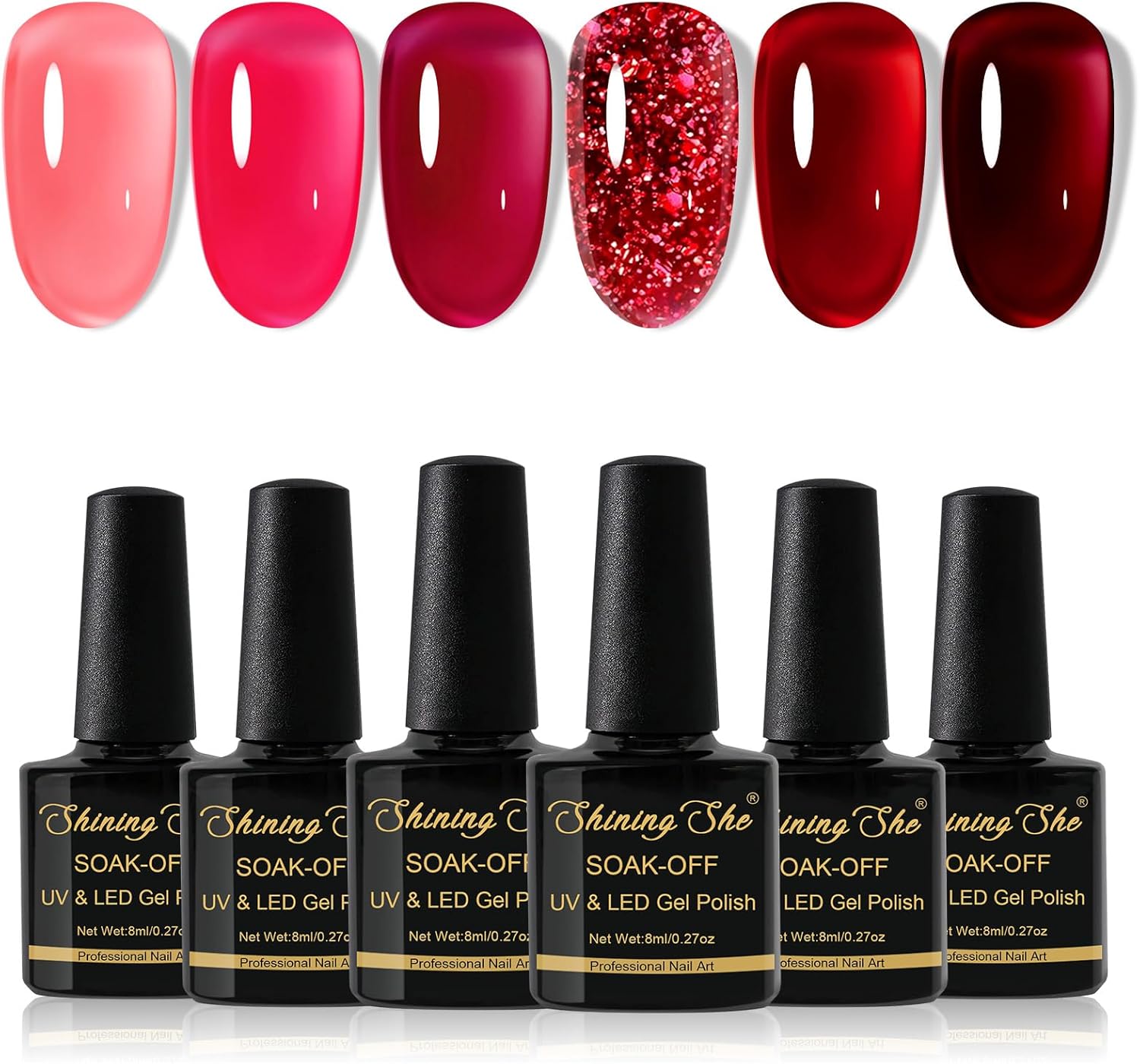 Shining She Jelly Gel Nail Polish, 6 Colors Crystals Burgundy Cherry Light Red Glitter Red Jelly Gel Polish,Gel Polish Set Soak-Off UV Nail Polish for Beginners DIY Nail Art at Home,10ml