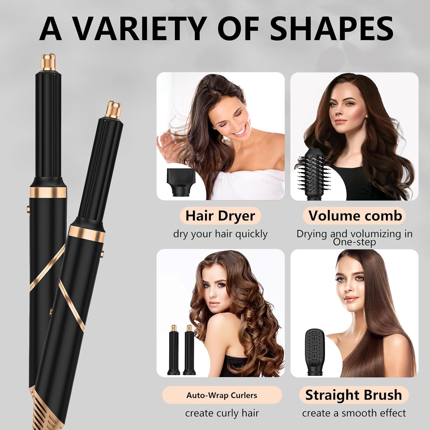 5-in-1 round bristle: make the hair smooth, volume and curly, meet the style of all of you in the house, you can quickly create the desired style.