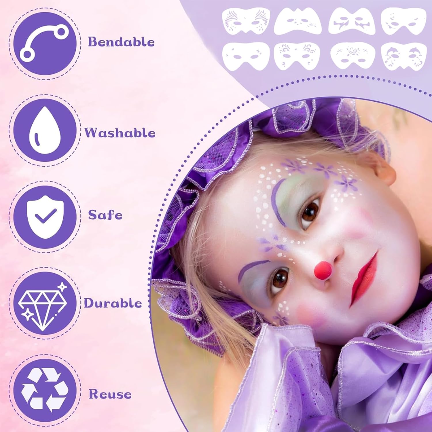 Easy to use: Face Paint templates Easy to use. Simply stick the stencil to your skin, spread the paint evenly with a sponge or brush, then remove the stencil to free up your work. Simply clean them with warm soapy water after each use and you’re ready for your next creative session.