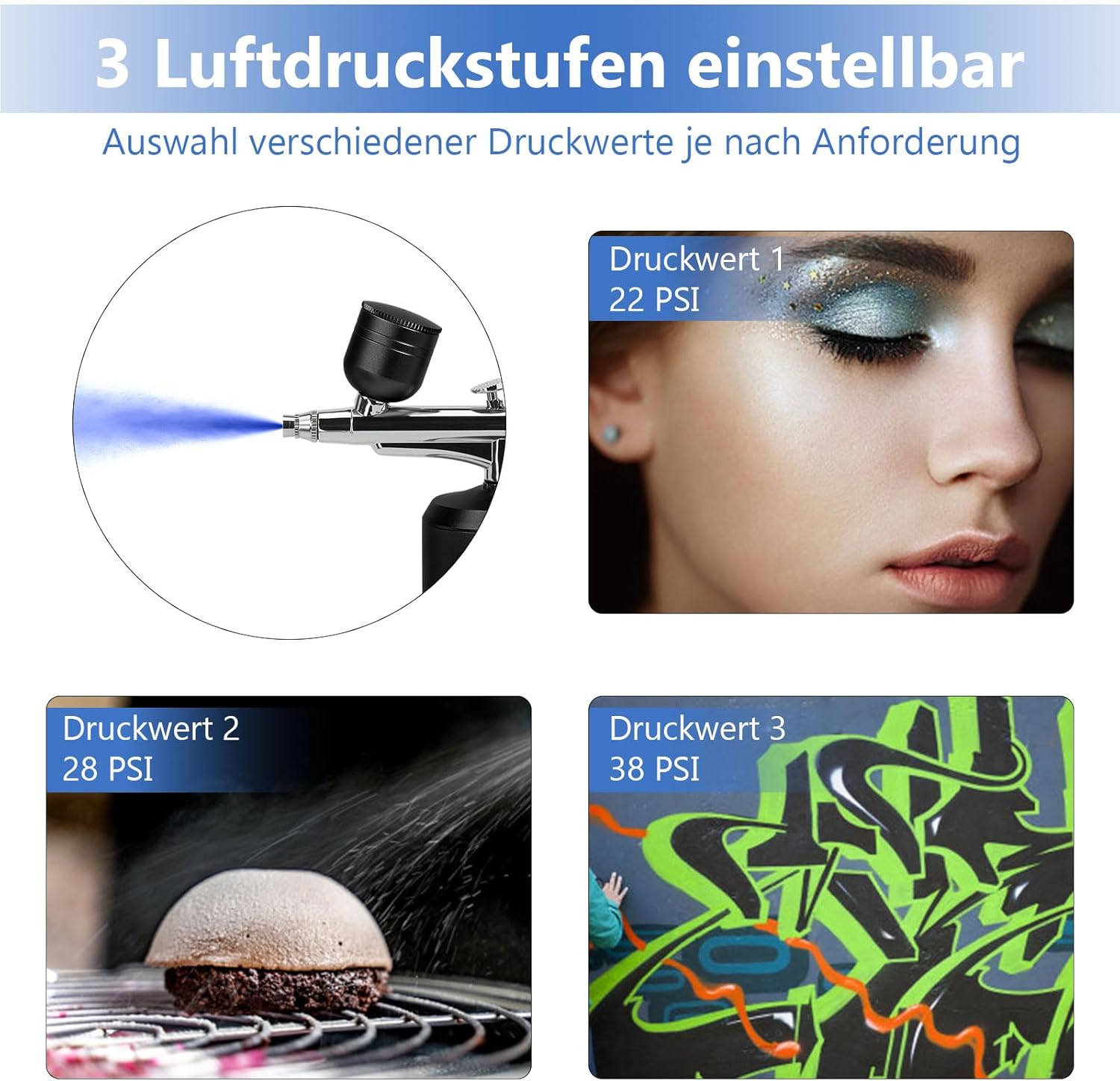 Rechargeable airbrush set: the mini airbrush set is compact and portable and therefore versatile. A pressure of 22 psi is suitable for airbrush makeup. Higher pressure 28/38PSI is suitable for airbrush, including art painting, cake decoration, nail art, crafting, model colors, illustration, temporary tattoos, hobby etc