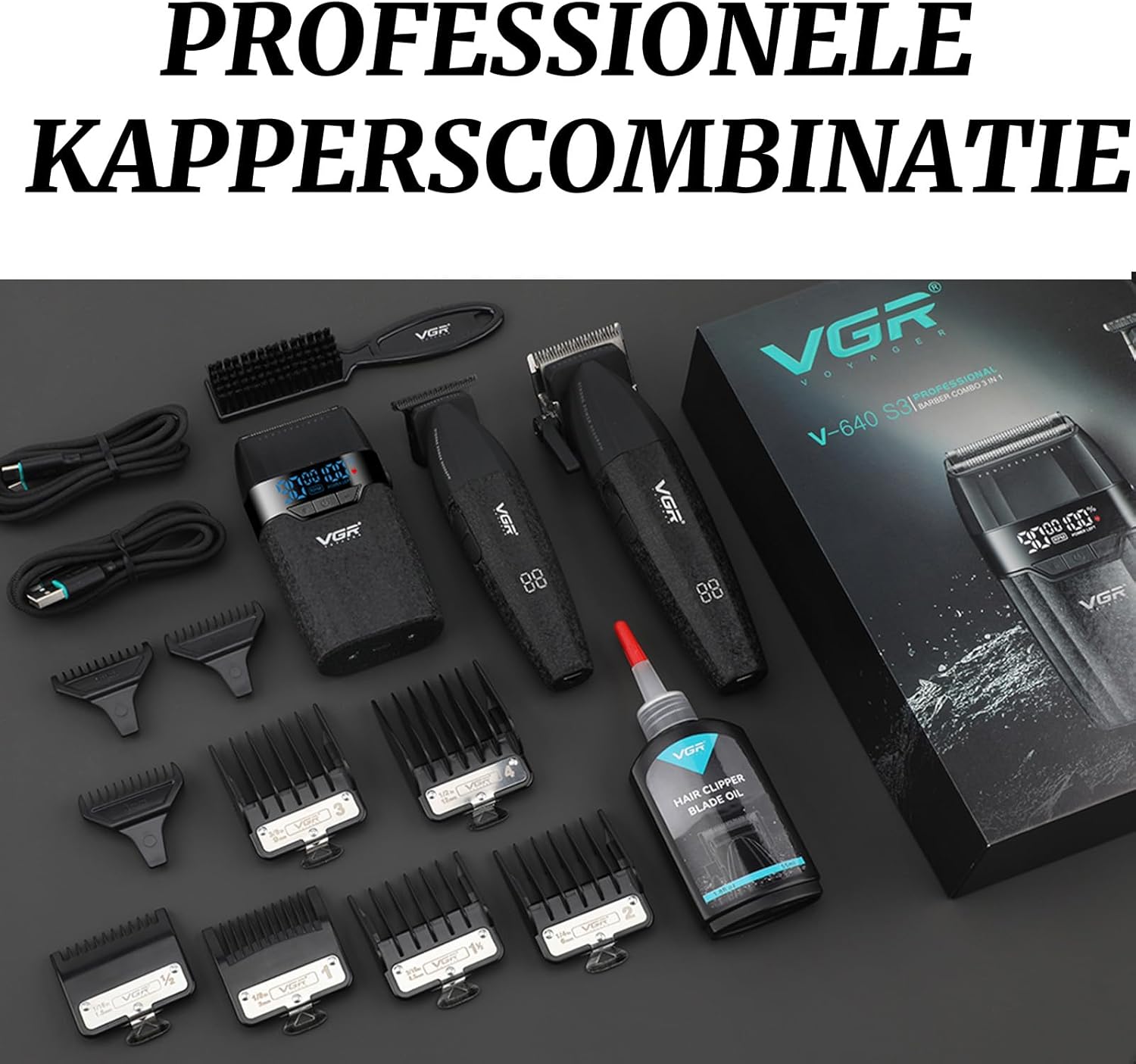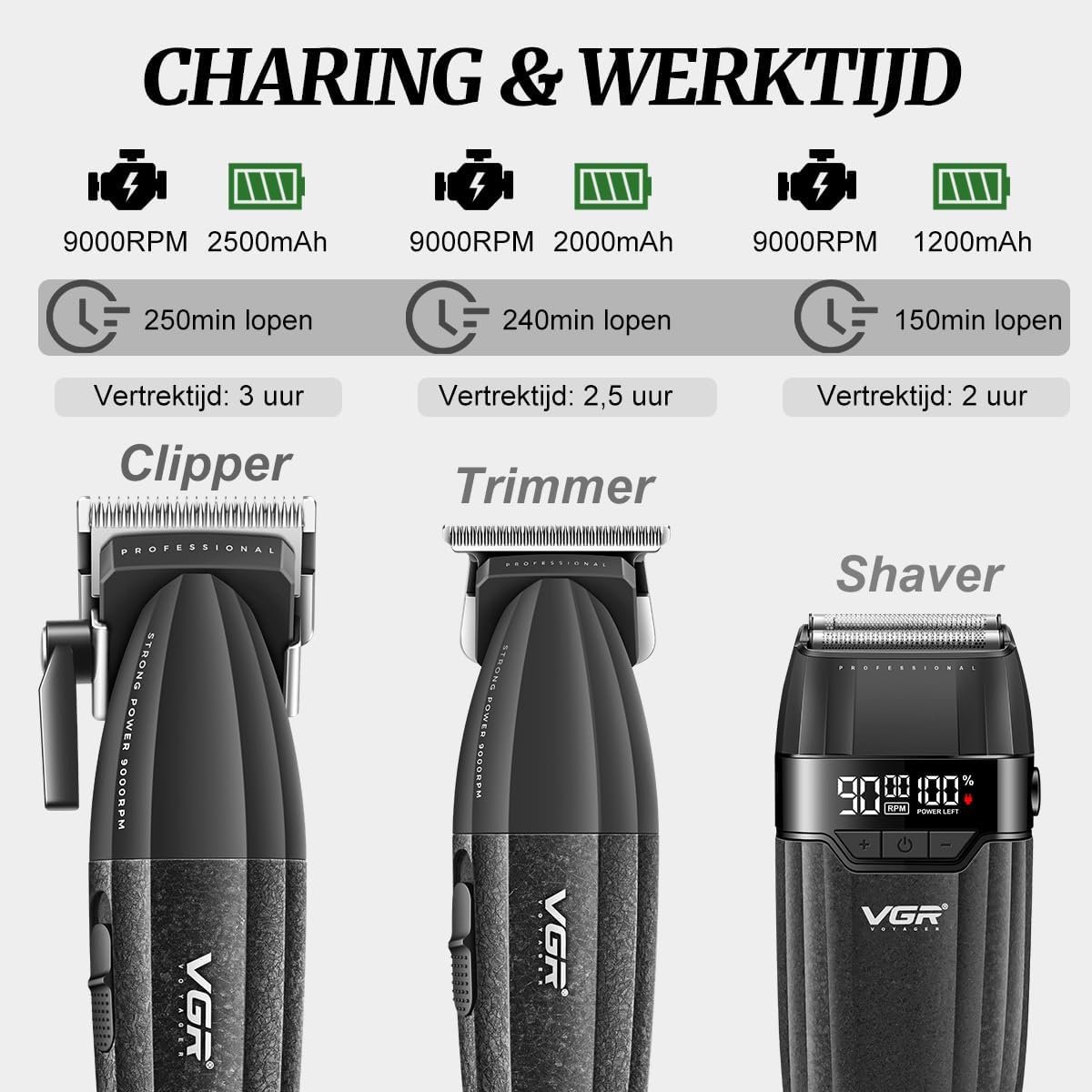High Performance 9000 RPM Motor and Long Lasting Battery: All units of the VGR 640 S3 are equipped with a powerful 9000 RPM motor for constant power. The electric hair clippers have a 2500 mAh battery, which provides 250 minutes of use after 3 hours of charging. The trimmer has a 2000 mAh battery for 240 minutes of use after 2.5 hours of charging. The shaver has a 1500 mAh battery that lasts 150 minutes after 1.5 hours of charging. USB charging provides convenience on the go