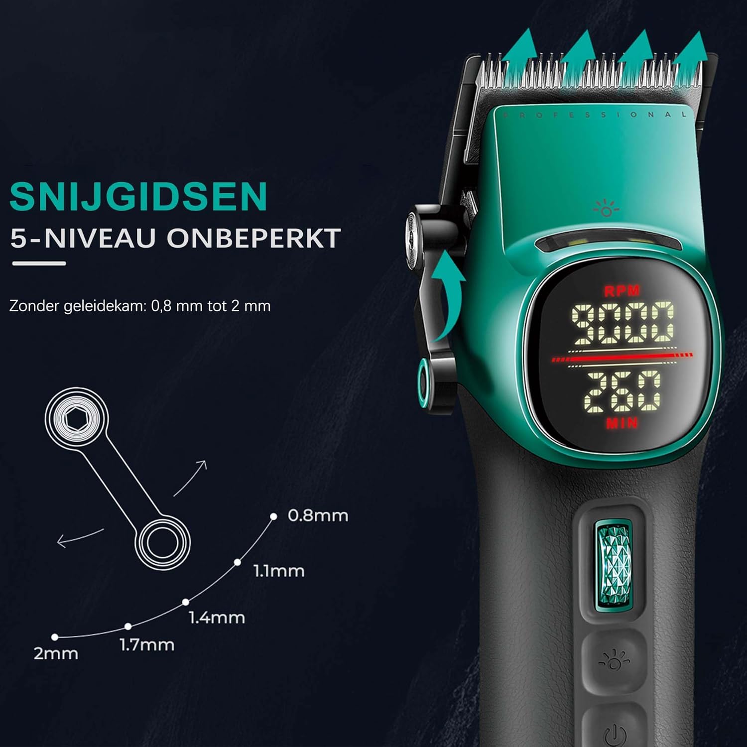 Dual charging options, innovative magnetic charging station: The hair trimmer for men is equipped with a 4600 mAh battery, which lasts 260 minutes after 3 hours of charging. The trimmer is equipped with a 2000 mAh battery, which lasts 180 minutes after 2 hours of charging. The two charging stations in this hairdressing set are equipped with a magnetic connection, which makes them one integrated charging station. Keep both devices charged at the same time and keep them clean and tidy