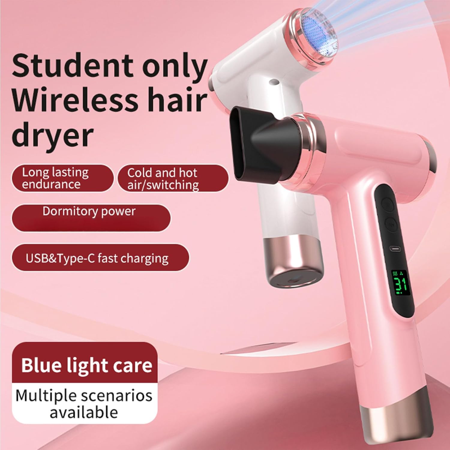 [Portable Hair Dryer USB Rechargeable Design] The portable hair dryers for women feature a 15000mAh lithium battery, which allows them to be used anywhere without the need for a power outlet. Enjoy styling on the go with ease. Travel hair dryer or dorm hair dryer.